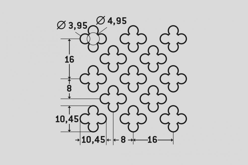 Děrovaný plech ocelový, ozdobné děrování Křížek No. 11. Rozměr 1000x2000 mm. Tloušťka plechu 1 mm. Vyrobeno dle DIN 24 041. Jakost DC01/DD11. Hmotnost 8,6 kg. Volná plocha 45 %. Po dlouhé straně je neděrovaný okraj cca 1 cm. Po krátké straně může být plech střižen přes otvory.