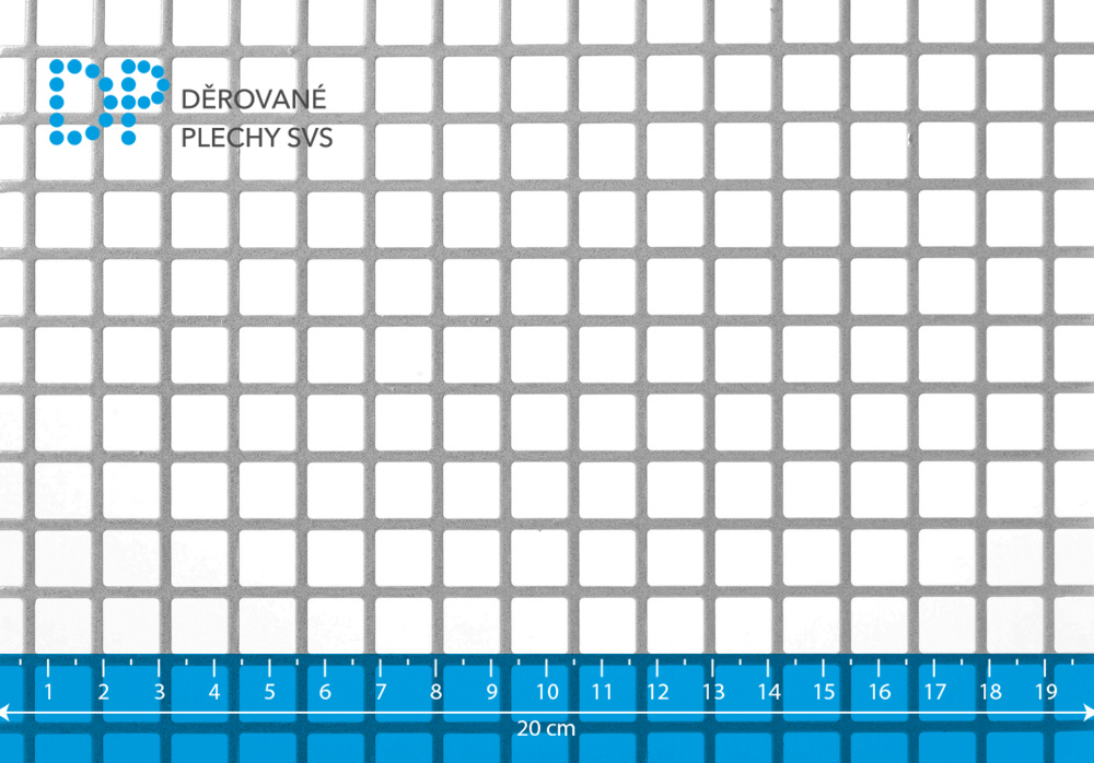 Děrovaný plech ocelový, čtvercové řadové děrování Qg 10-12 mm. Rozměr 1250x2500 mm. Tloušťka plechu 2 mm. Vyrobeno dle DIN 24 041. Jakost DC01/DD11. Hmotnost 15,3 kg. Volná plocha 69,44 %. Po dlouhé straně je neděrovaný okraj cca 1 cm. Po krátké straně může být plech střižen přes otvory.