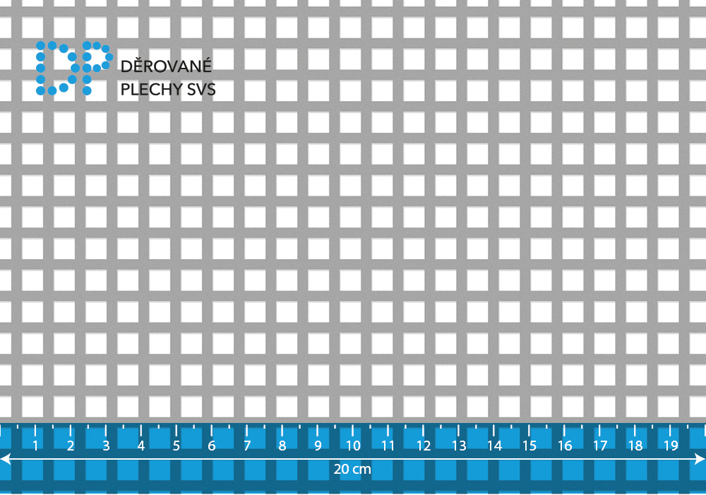 Děrovaný plech ocelový, čtvercové řadové děrování Qg 6-9 mm. Rozměr 1000x2000 mm. Tloušťka plechu 0.8 mm. Vyrobeno dle DIN 24 041. Jakost DC01/DD11. Hmotnost 7,12 kg. Volná plocha 44,44 %. Po dlouhé straně je neděrovaný okraj cca 1 cm. Po krátké straně může být plech střižen přes otvory.
