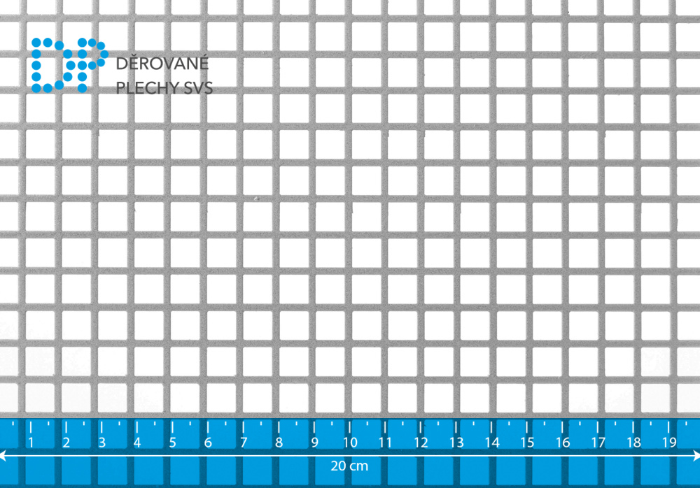 Děrovaný plech ocelový, čtvercové řadové děrování Qg 8-10 mm. Rozměr 1000x2000 mm. Tloušťka plechu 1 mm. Vyrobeno dle DIN 24 041. Jakost DC01/DD11. Hmotnost 6,4 kg. Volná plocha 64 %. Po dlouhé straně je neděrovaný okraj cca 1 cm. Po krátké straně může být plech střižen přes otvory.