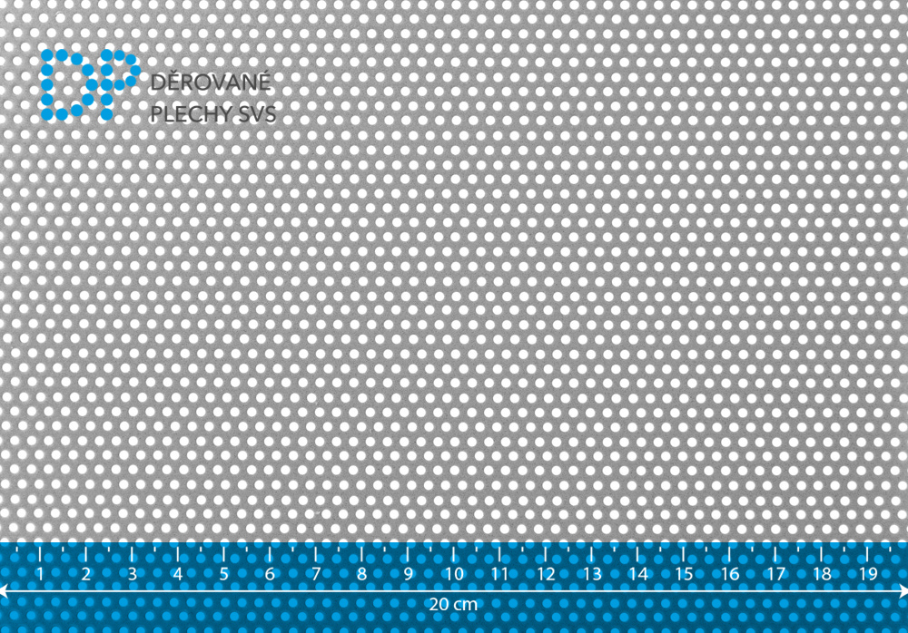 Děrovaný plech nerezový, kruhové přesazené děrování Rv 2-3.5 mm. Rozměr 1250x2500 mm. Tloušťka plechu 2 mm. Vyrobeno dle DIN 24 041. Jakost 1.4301. Hmotnost 35,2 kg. Volná plocha 29,61 %. Po dlouhé straně je neděrovaný okraj cca 1 cm. Po krátké straně může být plech střižen přes otvory. Jedná se o technické děrování a dle normy se v případě zlomení raznice toleruje neúplné nebo chybějící děrování na 2 % děrovaného plechu.