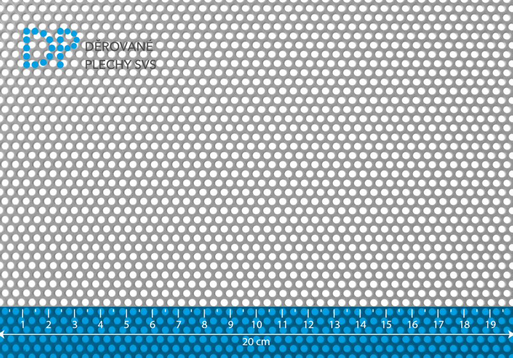 Děrovaný plech ocelový, kruhové přesazené děrování Rv 2.5-4 mm. Rozměr 1000x2000 mm. Tloušťka plechu 2 mm. Vyrobeno dle DIN 24 041. Jakost DC01/DD11. Hmotnost 20,7 kg. Volná plocha 35,43 %. Po dlouhé straně je neděrovaný okraj cca 1 cm. Po krátké straně může být plech střižen přes otvory.