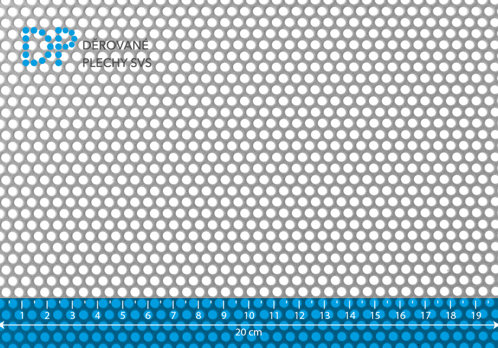 Děrovaný plech ocelový, kruhové přesazené děrování Rv 3.5-5 mm. Rozměr 1000x2000 mm. Tloušťka plechu 3 mm. Vyrobeno dle DIN 24 041. Jakost DC01/DD11. Hmotnost 26,69 kg. Volná plocha 44,44 %. Po dlouhé straně je neděrovaný okraj cca 1 cm. Po krátké straně může být plech střižen přes otvory.
