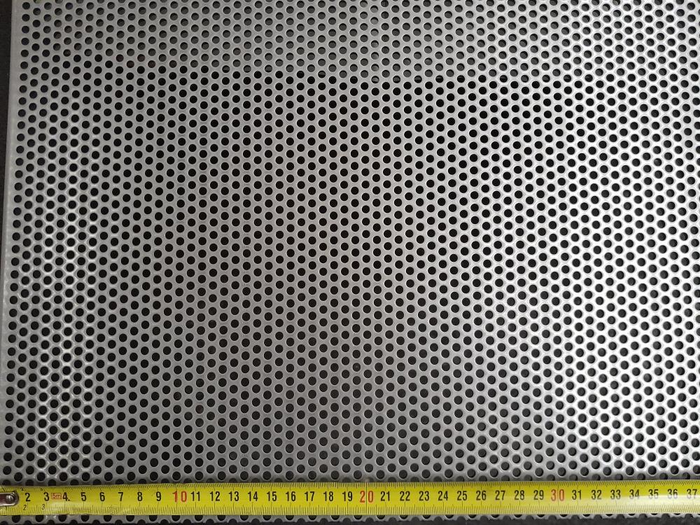 Děrovaný plech ocelový, kruhové přesazené děrování Rv 4.5-7 mm. Rozměr 1000x2000 mm. Tloušťka plechu 3 mm. Vyrobeno dle DIN 24 041. Jakost DC01/DD11. Hmotnost 33,6 kg. Volná plocha 37,48 %. Po dlouhé straně je neděrovaný okraj cca 1 cm. Po krátké straně může být plech střižen přes otvory.