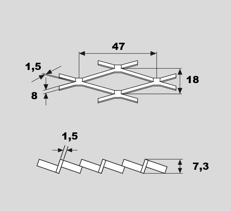 Tahokov ocelový s okem PRIVAT mm, můstek 47x18 mm. Jakost oceli DC01/DD11. Rozměr 2000 x 1500 mm (šířka 2000 mm, výška 1500 mm - délka oka (větší rozměr) je rovnoběžná se šířkou 2000 mm). Síla plechu 1.5 mm. Korigovaná výška 7.3 mm (tloušťka tahokovu z profilu). Vyrobeno dle DIN 791.