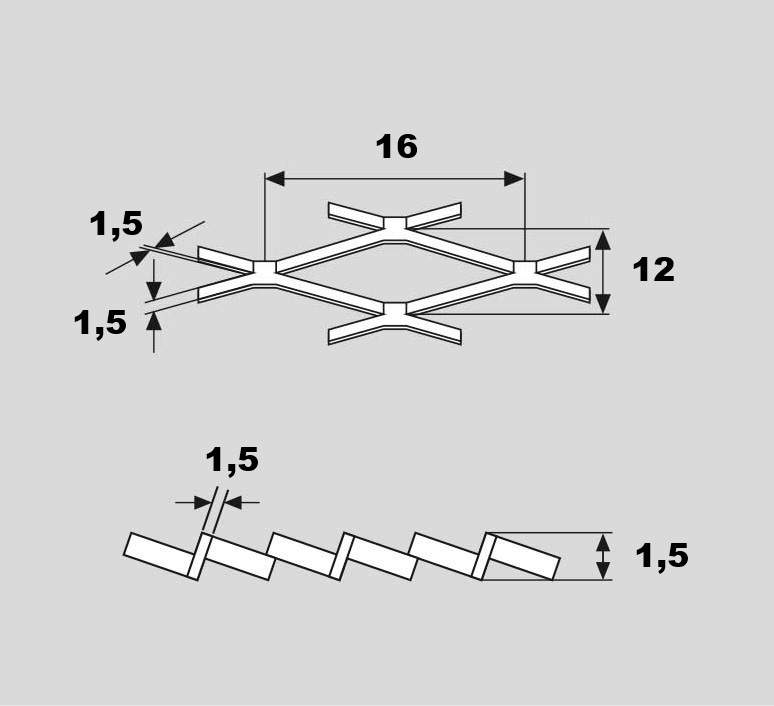 Tahokov ocelový s okem Q16x12 mm, můstek 1.5 mm. Jakost oceli DC01/DD11. Rozměr 1000 x 2000 mm (šířka 1000 mm, výška 2000 mm - délka oka (větší rozměr) je rovnoběžná se šířkou 1000 mm). Síla plechu 1.5 mm. Korigovaná výška 1.5 mm (tloušťka tahokovu z profilu - tahokov je válcovaný a výsledný boční profil je shodný s tloušťkou vstupního materiálu). Vyrobeno dle DIN 791.
