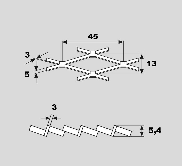Tahokov ocelový s okem 45x13 mm, můstek 5 mm. Jakost oceli DC01/DD11. Rozměr 1000 x 2000 mm (šířka 1000 mm, výška 2000 mm - délka oka (větší rozměr) je rovnoběžná se šířkou 1000 mm). Síla plechu 3 mm. Korigovaná výška 5.4 mm (tloušťka tahokovu z profilu). Vyrobeno dle DIN 791.