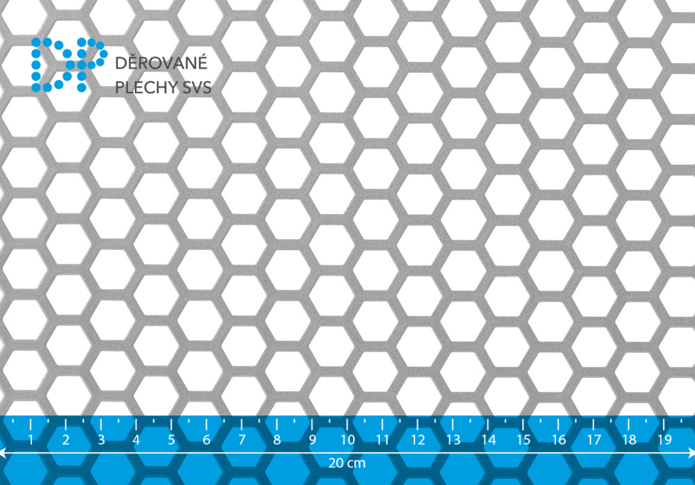 Děrovaný plech ocelový, šestihranné děrování Hv 11-14 mm. Rozměr 1000x2000 mm. Tloušťka plechu 1.5 mm. Vyrobeno dle DIN 24 041. Jakost DC01/DD11. Hmotnost 9,08 kg. Volná plocha 62,2 %. Po dlouhé straně je neděrovaný okraj cca 1 cm. Po krátké straně může být plech střižen přes otvory.