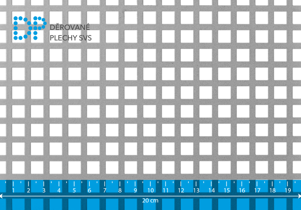 Děrovaný plech hliníkový, čtvercové řadové děrování Qg 8-12 mm. Rozměr 1000x2000 mm. Tloušťka plechu 2 mm. Vyrobeno dle DIN 24 041. Jakost Al 99,5 % - čistý hliník. Hmotnost 6,19 kg. Volná plocha 44,44 %. Po dlouhé straně je neděrovaný okraj cca 1 cm. Po krátké straně může být plech střižen přes otvory.