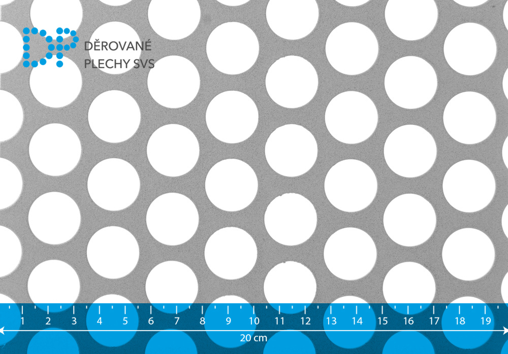 Děrovaný plech ocelový, kruhové přesazené děrování Rv 20-26 mm. Rozměr 1000x2000 mm. Tloušťka plechu 1.5 mm. Vyrobeno dle DIN 24 041. Jakost DC01/DD11. Hmotnost 11,12 kg. Volná plocha 53,66 %. Po dlouhé straně je neděrovaný okraj cca 1 cm. Po krátké straně může být plech střižen přes otvory.