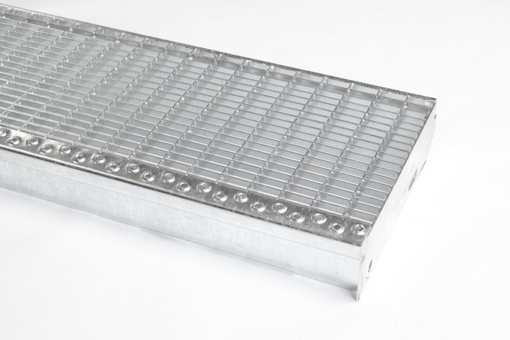 Pozinkované schodišťové stupně 1200x270 mm s okem 30x10 mm. Minimální garantovaná nosnost 408 kg. Hmotnost 9.4 kg. Třída protiskluzu R11. Vyrobeno dle DIN 24531-1. Stupně splňují normu pro úniková schodiště.