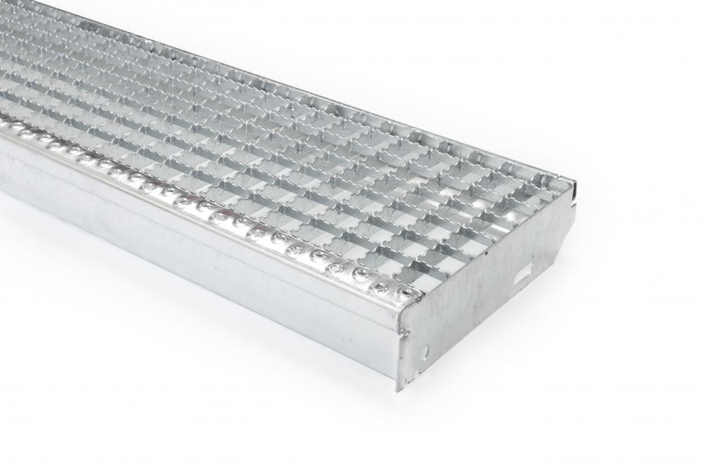 Pozinkované schodišťové stupně protiskluzové 1200x270 mm s okem 30x30 mm. Minimální garantovaná nosnost 408 kg. Hmotnost 7.6 kg. Třída protiskluzu R13. Vyrobeno dle DIN 24531-1. Stupně splňují normu pro úniková schodiště.