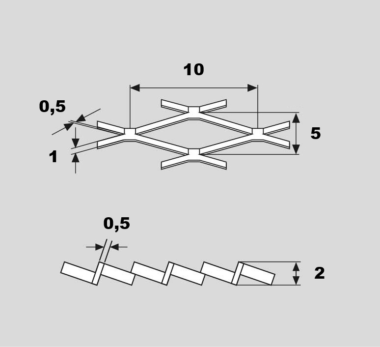 Tahokov nerezový s okem 10x5 mm, můstek 1 mm. Jakost nerezi 1.4301 - AISI 304. Rozměr 1000x2000 mm (šířka 1000 mm, výška 2000 mm - délka oka (větší rozměr) je rovnoběžná se šířkou 1000 mm). Síla plechu 0.5 mm. Korigovaná výška 2 mm (tloušťka tahokovu z profilu). Vyrobeno dle DIN 791.