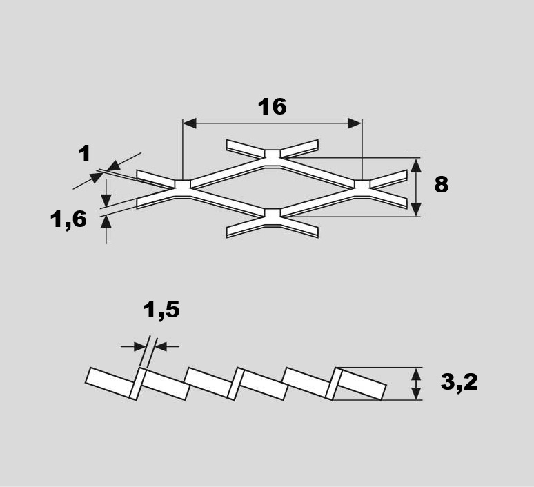 Tahokov ocelový s okem 16x8 mm, můstek 1.6 mm. Jakost oceli DC01/DD11. Rozměr 1000 x 2000 mm (šířka 1000 mm, výška 2000 mm - délka oka (větší rozměr) je rovnoběžná se šířkou 1000 mm). Síla plechu 1.5 mm. Korigovaná výška 3.2 mm (tloušťka tahokovu z profilu). Vyrobeno dle DIN 791.