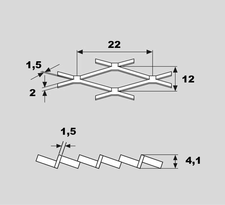 Tahokov ocelový s okem 22x12 mm, můstek 2 mm. Jakost oceli DC01/DD11. Rozměr 1000 x 2000 mm (šířka 1000 mm, výška 2000 mm - délka oka (větší rozměr) je rovnoběžná se šířkou 1000 mm). Síla plechu 1.5 mm. Korigovaná výška 4.1 mm (tloušťka tahokovu z profilu). Vyrobeno dle DIN 791.
