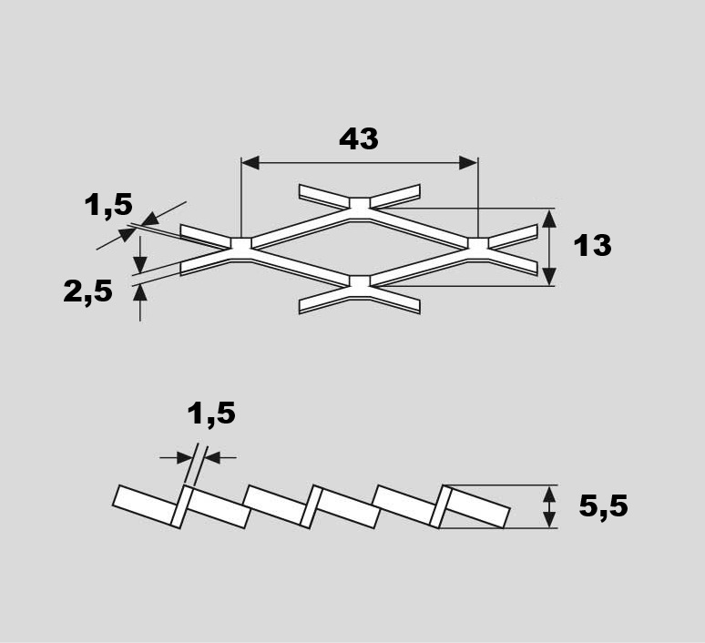 Tahokov ocelový s okem 43x13 mm, můstek 2.5 mm. Jakost oceli DC01/DD11. Rozměr 1000 x 2000 mm (šířka 1000 mm, výška 2000 mm - délka oka (větší rozměr) je rovnoběžná se šířkou 1000 mm). Síla plechu 1.5 mm. Korigovaná výška 5.5 mm (tloušťka tahokovu z profilu). Vyrobeno dle DIN 791.