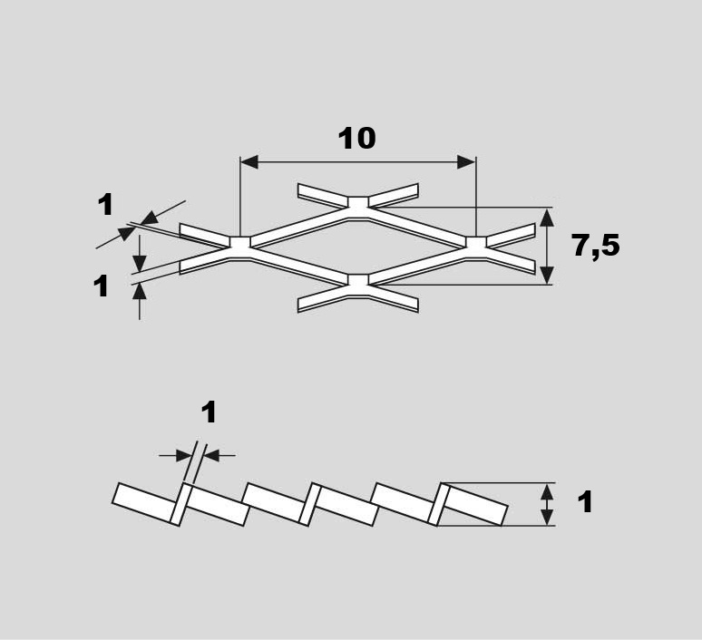 Tahokov pozinkovaný s okem Q10x7,5, můstek 1 mm. Plech je zinkovaný ještě před děrováním, tudíž střižné hrany nejsou zinkem ošetřeny. Rozměr 1250 x 2500 mm (šířka 1250 mm, výška 2500 mm - délka oka (větší rozměr) je rovnoběžná se šířkou 1250 mm). Síla plechu 1 mm. Korigovaná výška 1 mm (tloušťka tahokovu z profilu - tahokov je válcovaný a výsledný boční profil je shodný s tloušťkou vstupního materiálu). Vyrobeno dle DIN 791.