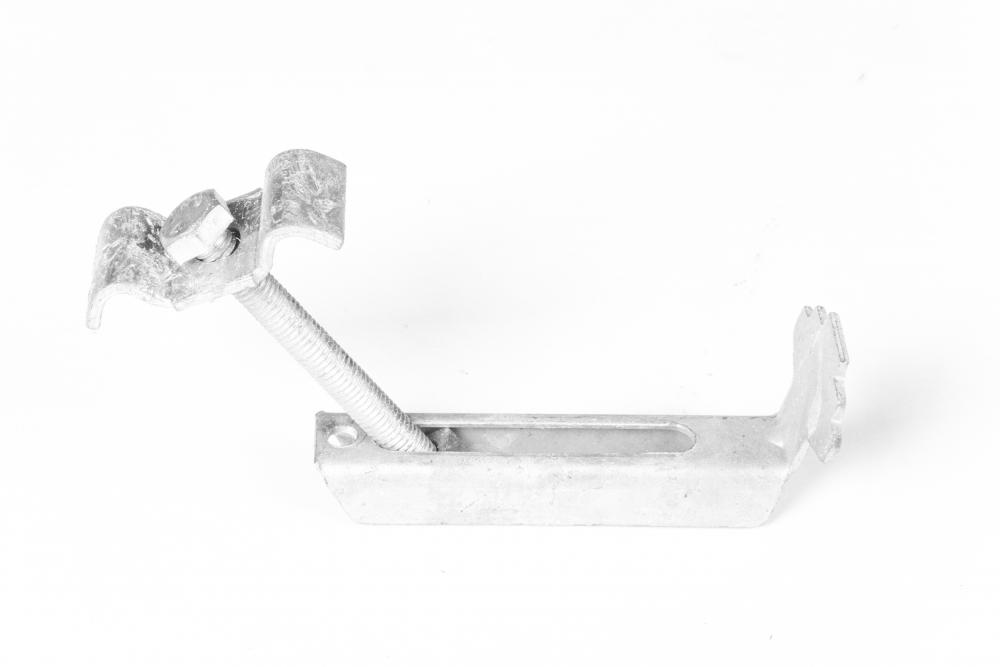 Pozinkovaná svorka s profilovou příložkou a šroubem vhodná pro rošty s okem 30x30mm.